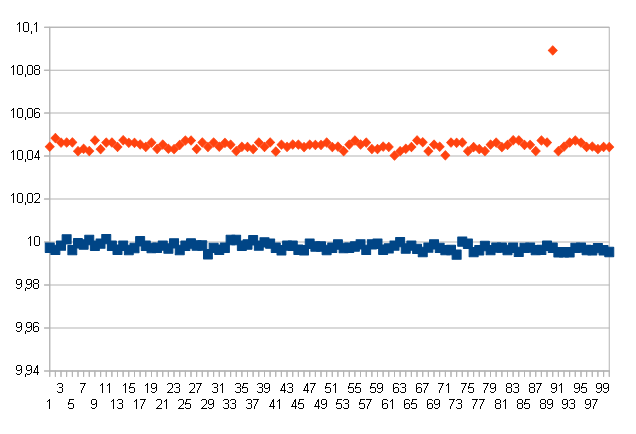 Тест 1. В качестве «эталонного» отверстия была использована внутренняя обойма подшипника (диаметр отверстия 10 мм). В отверстие помещался щуп ЦИ, после чего 100 раз выполнялся поиск центра по алгоритму «6 касаний». Координаты найденного центра, а также результаты расчетов диаметра отверстия по X и Y записывались в файл. Скорость предварительного поиска — 600 мм/мин, уточняющего — 60.