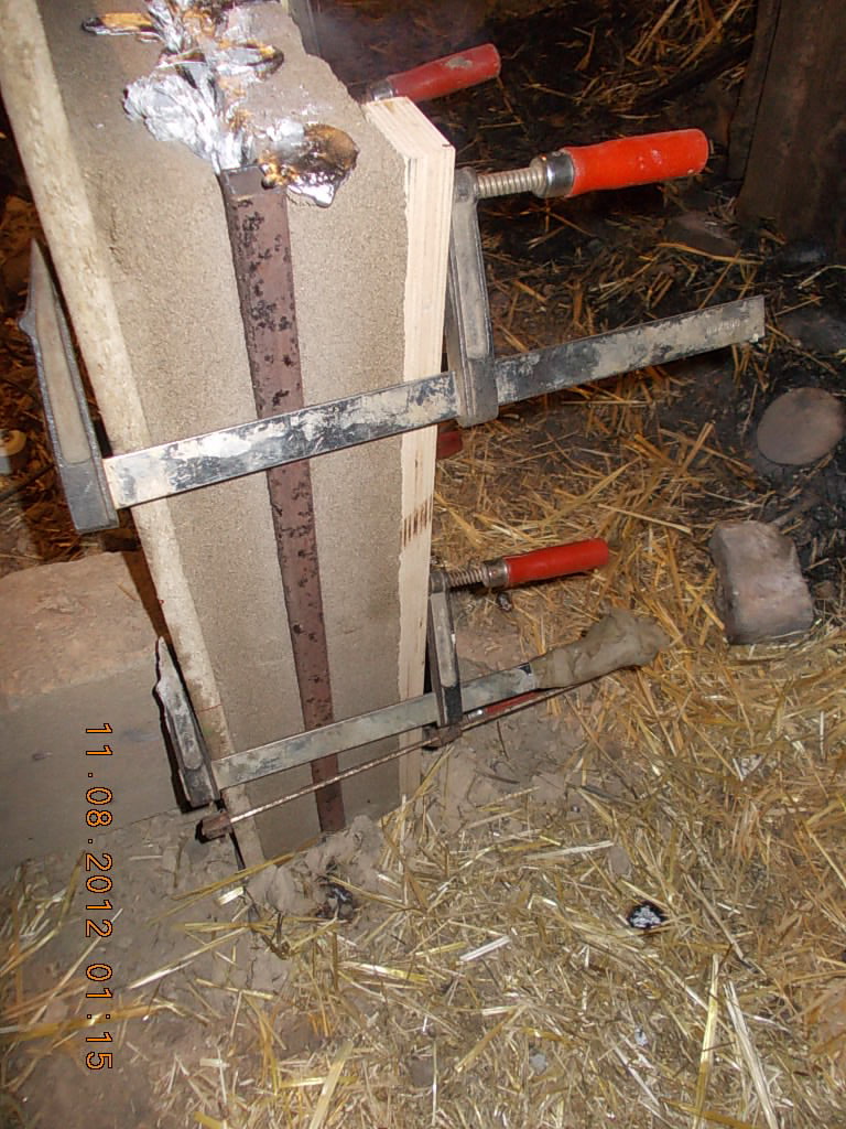 "кокиль" из ЖС и песка. Сделали 2 плиты из песка. Ставлю их вертикально, а между ними задаем толщину отливки квадратой тубой и стягиваю струбцинами :hehehe: