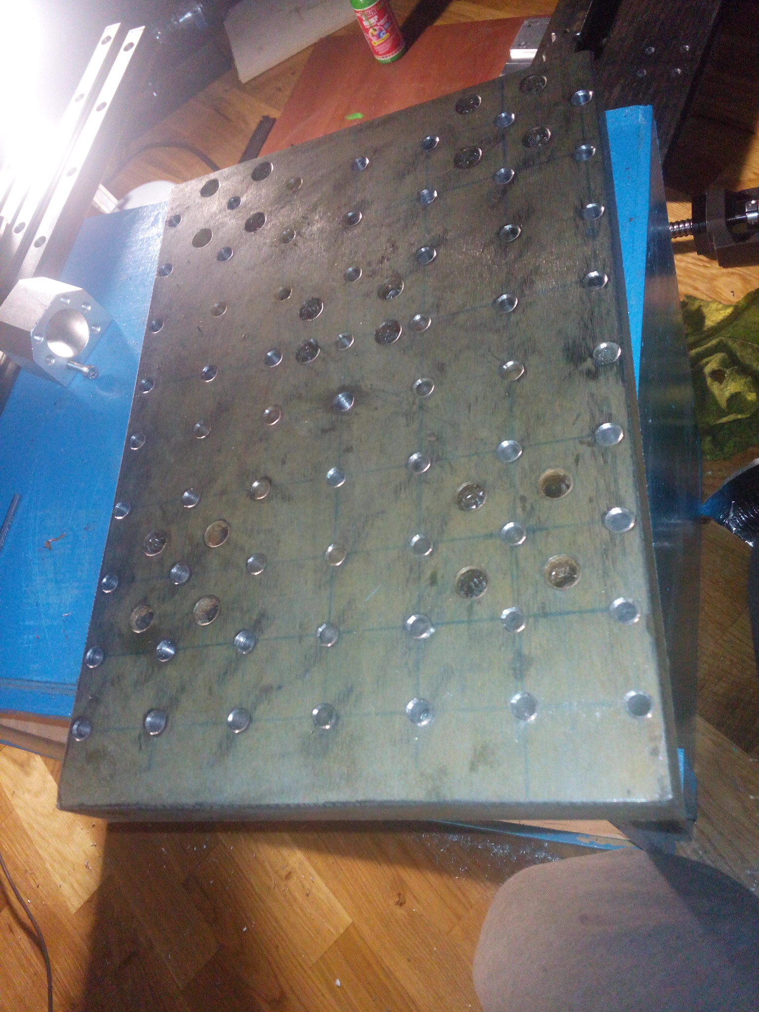 В 40мм плите просверлил почти 100 отверстий. Хорошо если сегодня одну третью часть успею нарезать резьбу. Вообщем это своеобразный Т-стол, или УСП стол.(подвижный стол станка).