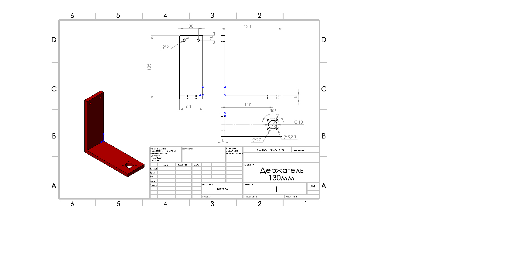 2. Держатель подъёмного столика 135х130 мм. В начале планировалось из алюминия, но вполне пойдёт из хорошего железа (сталь там не к чему), толщины хватит и 3 мм (на чертеже заложено 8 мм), главное что бы внешние размеры остались верными. Нужно соблюсти угол 90 градусов, количество 2 штуки: