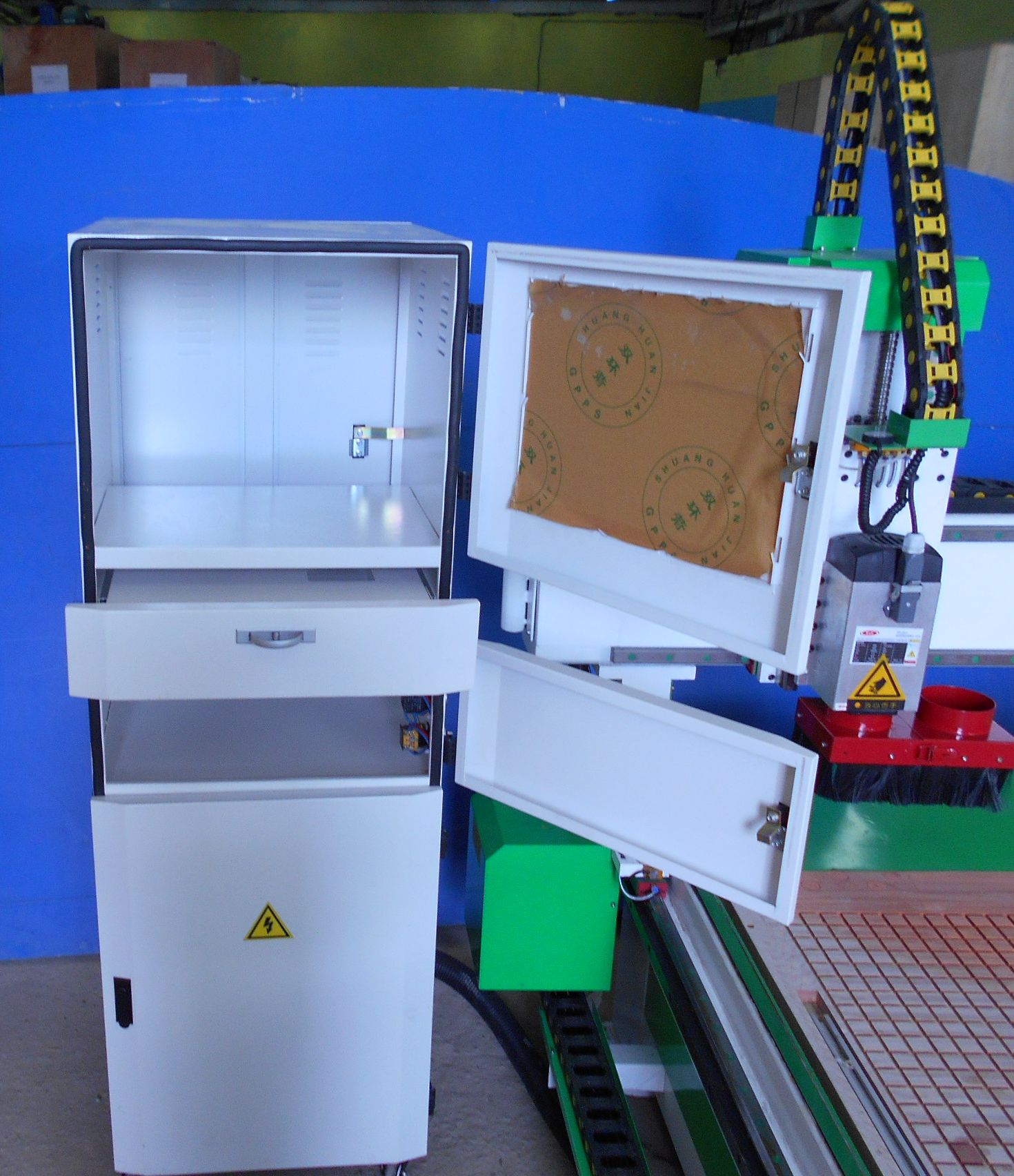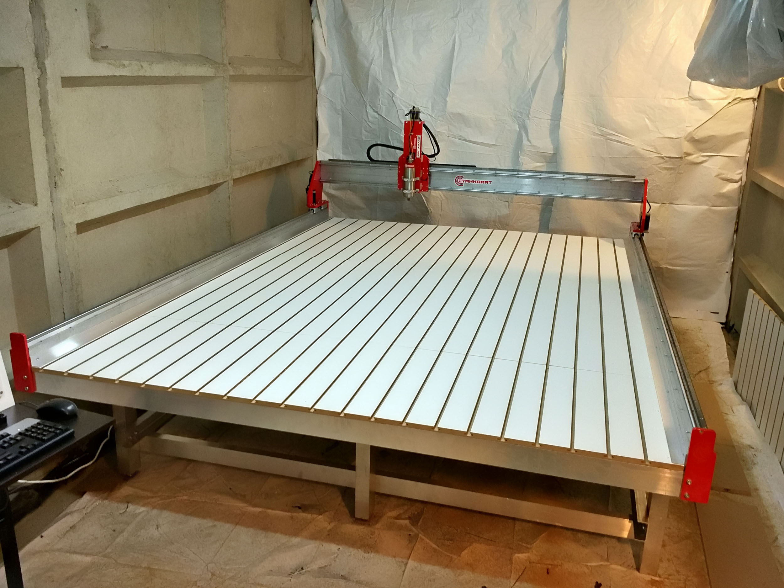 Материал стола – МДФ с Т-пазами. Может быть установлен реечный алюминиевый стол - +80000руб к стоимости станка.