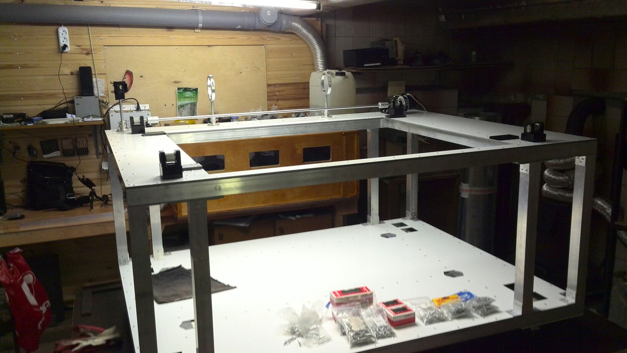 Раму делаю сборную из алюминия, (вот сейчас и делаю =)) Электроника будет в столе, вытяжка уже стоит на своем месте.