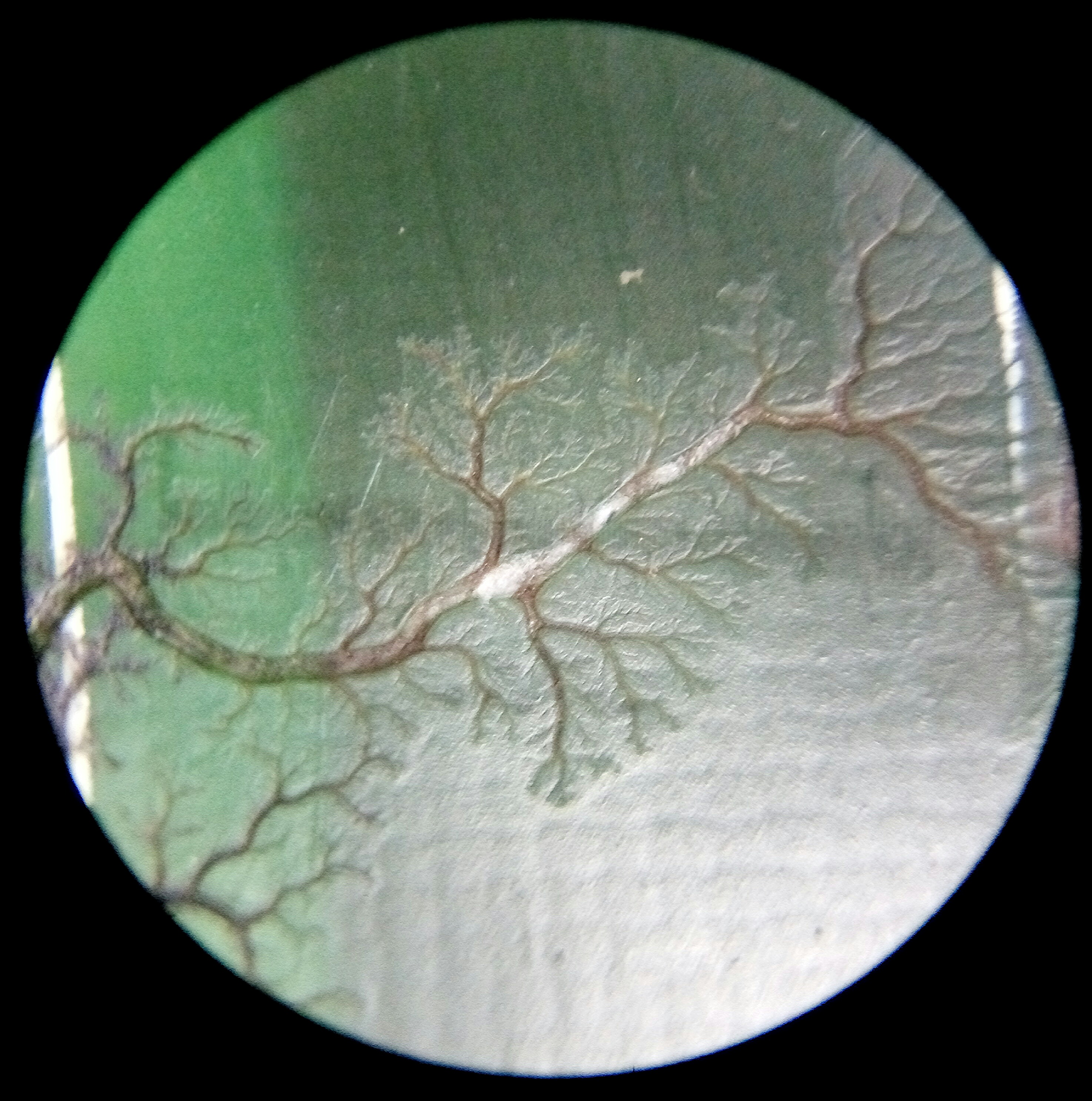 А вот так ток находит себе дорогу, когда вентилятор накидывает достаточно грязи на плату. Клемма - +600VDC, резистор - GND.