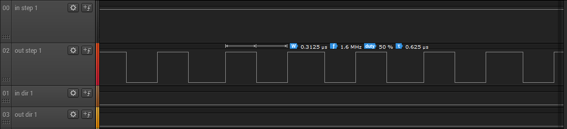 Входящие шаги ловим, как и прежде, с помощью EXTI. Для замера периодов между входящими шагами используем отдельный аппаратный таймер. Для вывода шагов каждой оси используются отдельные аппаратные таймеры. У каждого таймера есть 4 канала, используем только один в режиме Output Compare.