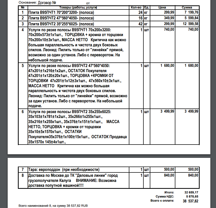 Прислали мне рассчет распила: нетрудно посчитать, что за 82 кг В95ПЧТ2 вместе с резкой, упаковкой на поддон и доставкой до ТК мне придется заплатить 38 с полтиной килорублей. И это без скидки)) А с ней - ощутимо меньше...