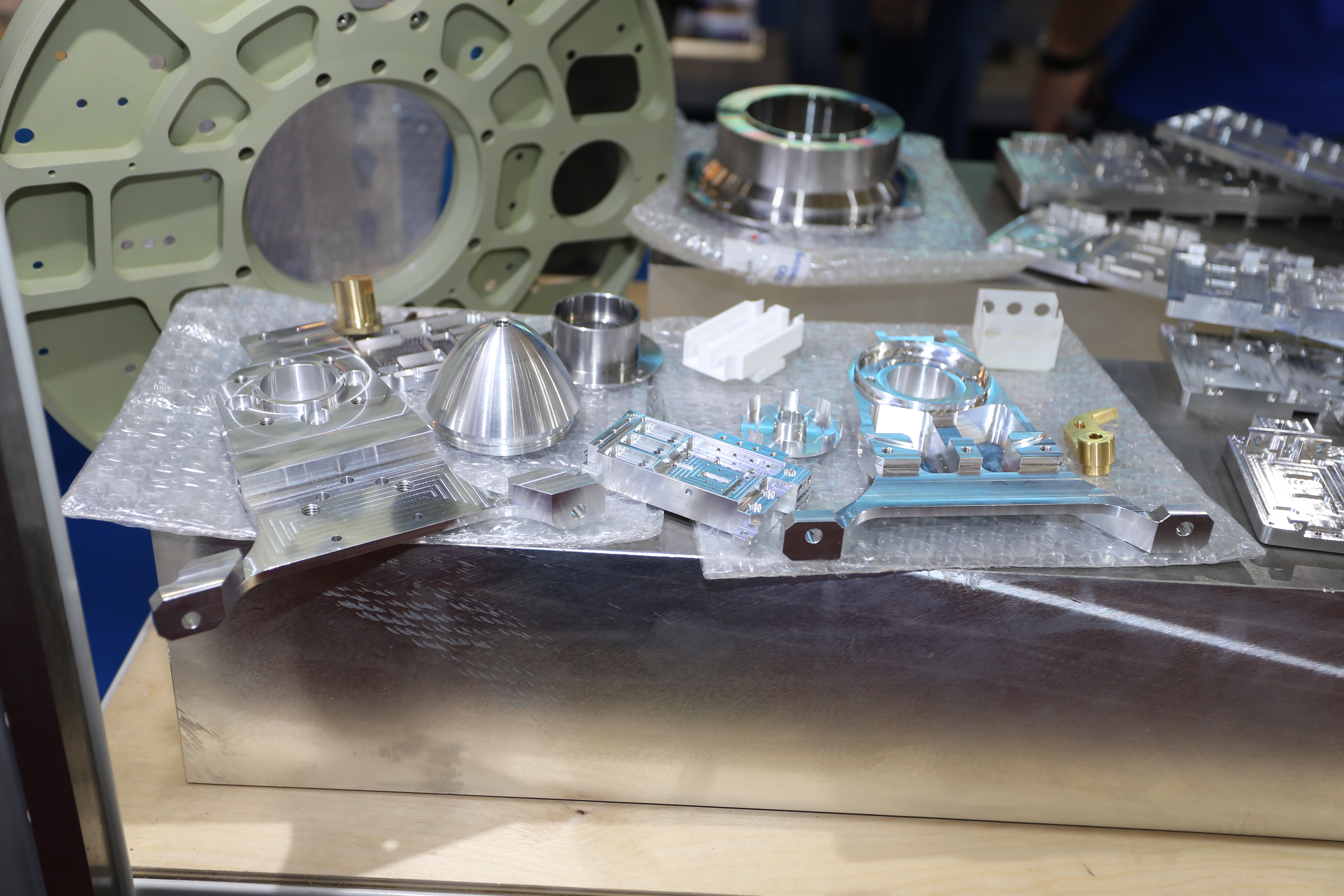 Однако ж стенд собрали, стали расставлять всякие заготовки из Д16т ,В95ПЧТ2, АК4-1ЧТ, АМГ6, В93ПЧ и др. Надо же, нам даже один форумчанин помог изготовить фирменные подарки для посетителей из клуба-cnc.