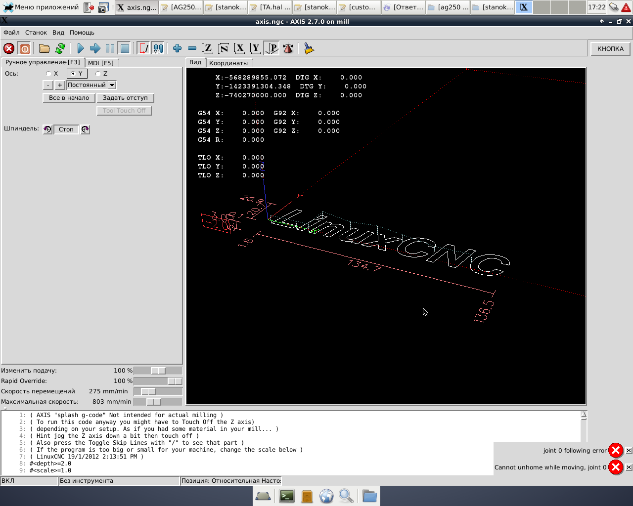 Ничего не пойму. Пока не включена сила, кнопки активны. Стоит включить силу, станок пытается шевельнуться и сразу выскакивает ошибка Joint 1 Following Error и кнопки становятся неактивными. Что причина, а что следствие? Куда копать? Соответсвенно, при включении силы начинается дрейф всех осей.