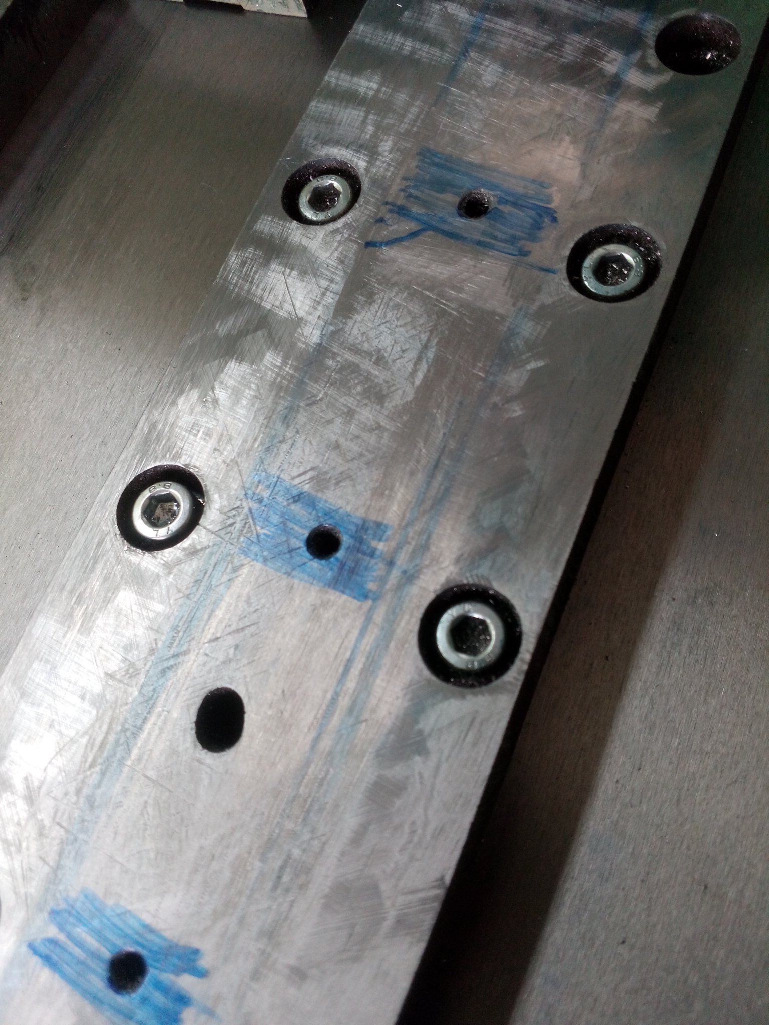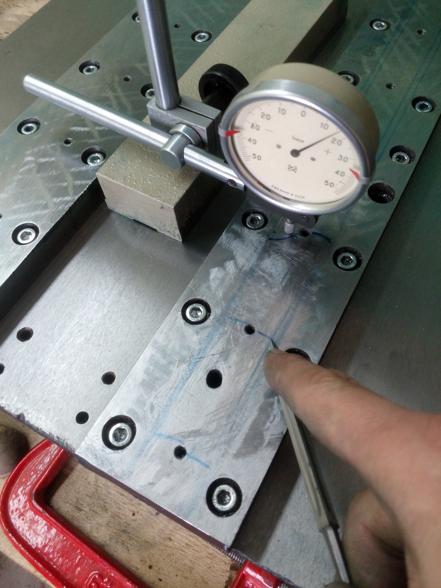 Потому берем два участка это полосы(от резьбы до резьбы) шириной 8-10 мм(ширина резьбы +по 2мм на края) и на 20-35 мм (ширина рельс) микро шабером выводим на любую нужную точность, а дальше уже расстояние между резьба отверстиями выводим на любую точность обычным шабером, посредством краски на линейку. Удобнее работать с маленькими линейками...