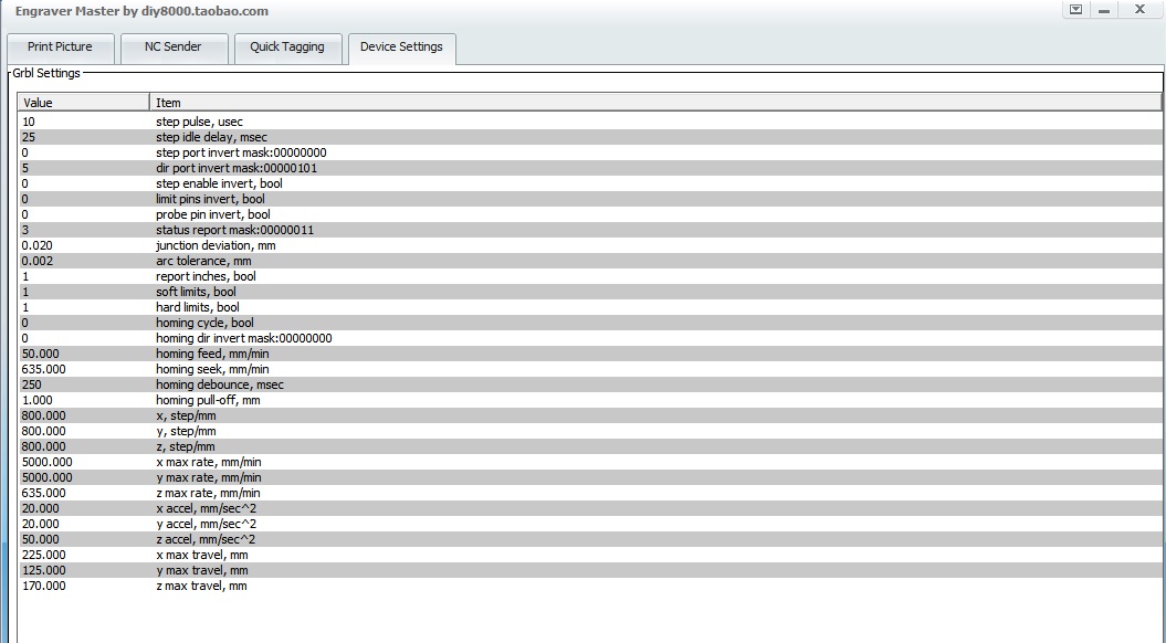 COM3 115200. Залез в grbl настройки через LiteFire начал выставлять значения как в доковском файле который прислал продавец, двигатели делают пару шагов и опять встают, программа виснет. Значения в коде меняются.