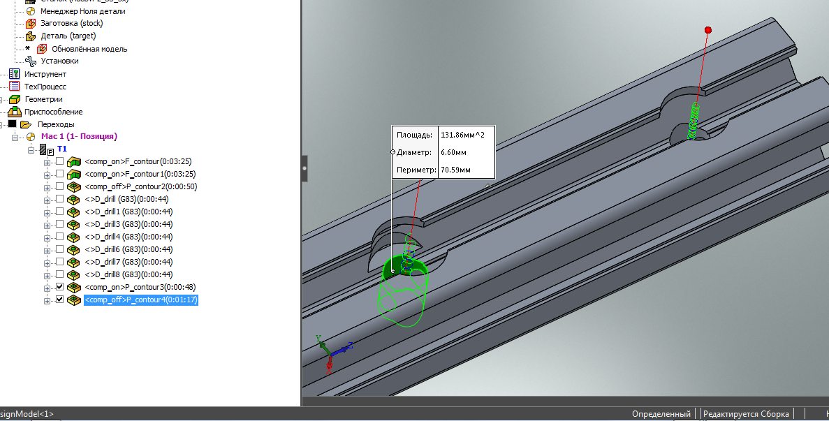 Добрый день ! Решился написать сюда впервые т.к ответа на просторах сети не нашел. Имеем - solidcam 2015 и станок от purelogic с управлением mach3. необходимо обработать круглый карман (2 шт), диаметр кармана - 6,60мм, фреза 5мм,, создаем обработку кармана - ставим подвод по спирали. Все 2 кармана делаем с одинаковыми настройками. Проблема в том что в визуализации фреза внутри первого кармана движется по спирали постепенно углубляясь. Все ок. А во втором кармане при визуализации начинает дергаться, по анимации видно что даже половины нужной области просто не обрабатывает. и далее при генерации G-кода в первом случае получаем код скажем на 1000 строк а во втором от силы на 200 строк. ( пост процессор стандартный солидовский gMill_MDAV4_Mach3_4x)