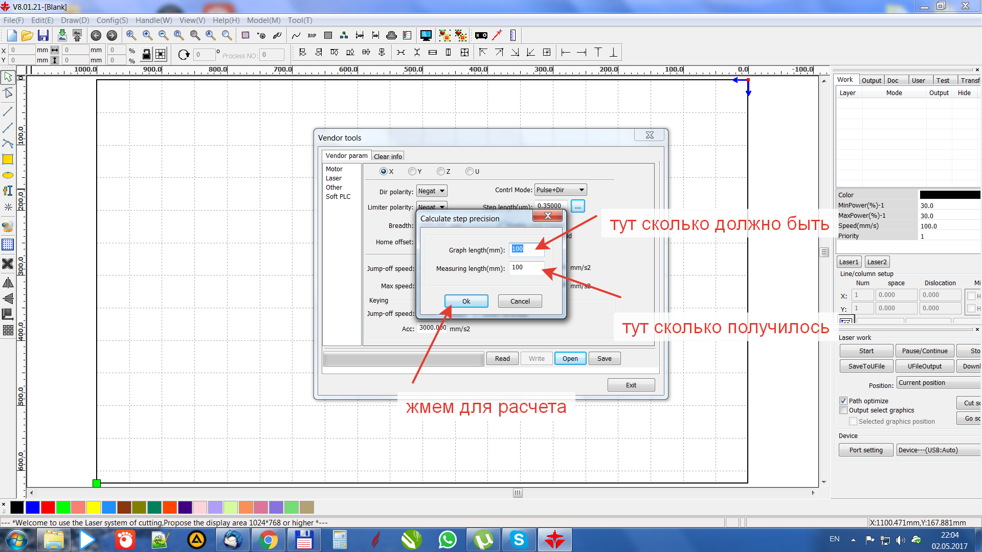 C этим все просто до безобразия! Делаем УП для резки квадрат к примеру 100х100мм(лучше конечно фигуру начертить большего размера, для лучшей точности) и режем/чертим. Измеряем то что получилось с максимально высокой точностью. В Rdworks топаем в Vendor Settings и далее: