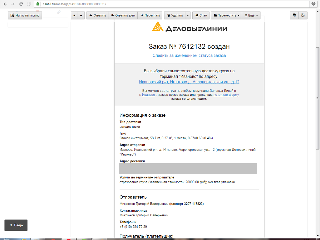 сообщение из транспортной "Деловые линии" о создании предварительного заказа, с паспортными