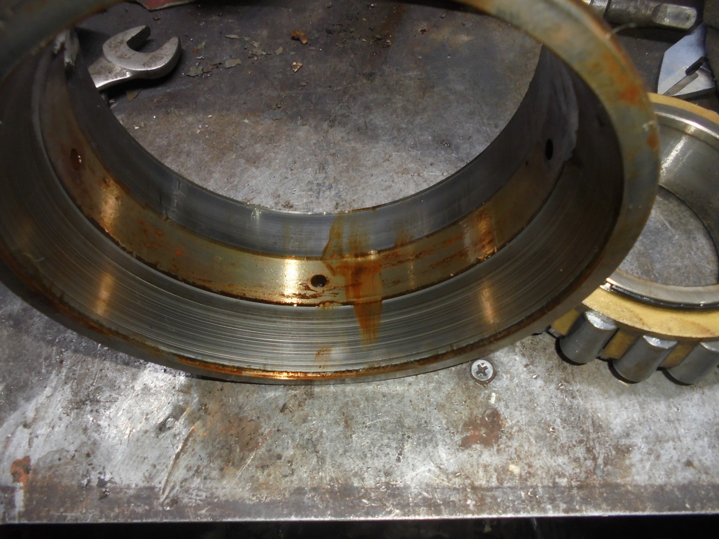 Станок б/у брали весь грязный и ржавый. Подшипы нужно было менять сразу, но пока работали так. Фильтра можно сказать не было - он весь дырявый. Подшипники пару раз потягивали на два щелчка. До нас уже подшипники подтягивали не раз.