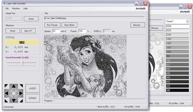 ArrSoft писал(а):здравствуйте, у меня к вам просьба: Вы же используете ГРБЛ, Вы могли бы установить мою программу для выжигания лазером и установить мою прошивку, и тогда сообщить о результате?