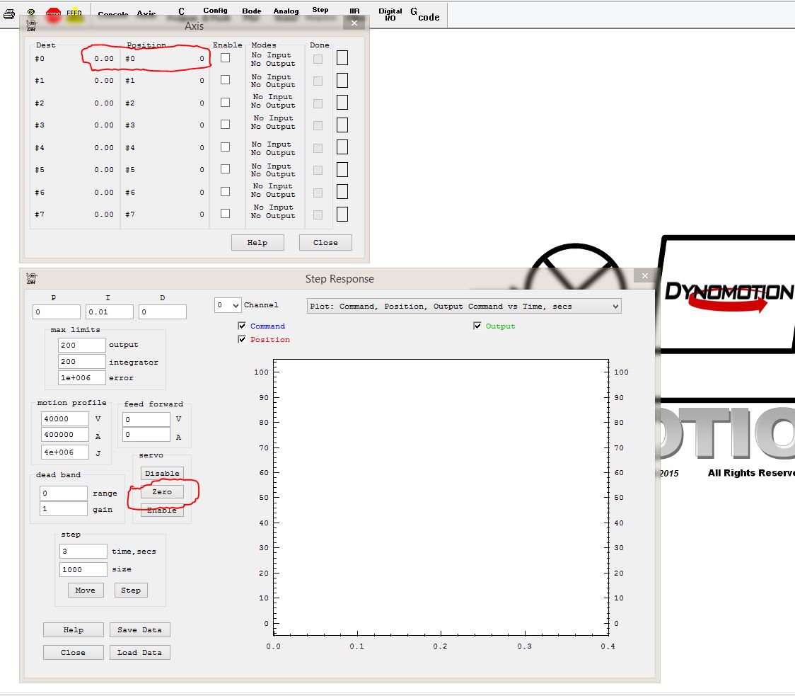 В Кмоушн значения на вкладке AXIS обнуляются нажатием кнопки ZERO на вкладке STEP RESPONSE