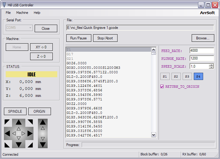 Кнопки S1, S2, S3 и S4 меняют скорость вращения шпинделя, и доступны во время выполнения программы.