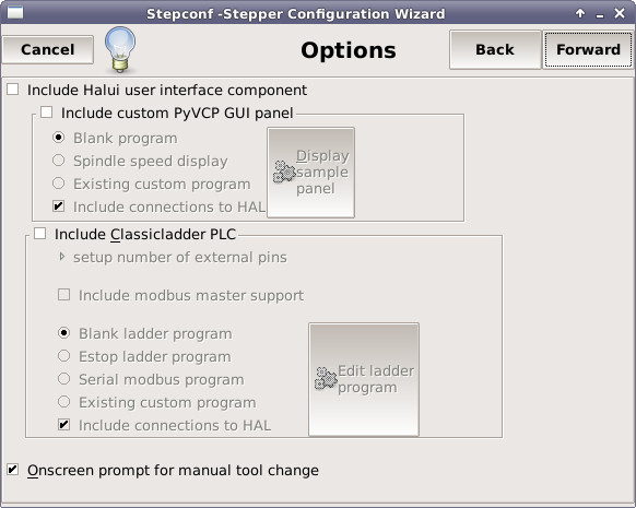 Onscreen prompt for tool change - уведомление о смене инструмента. Если эта опция включена, то EMC2 будет останавливаться и выдавать сообщение о смене инструмента, каждый раз, когда в управляющей программе будет встречаться код M6. Оставьте эту опцию включенной, только если Вы не собираетесь делать автоматическую смену инструмента.