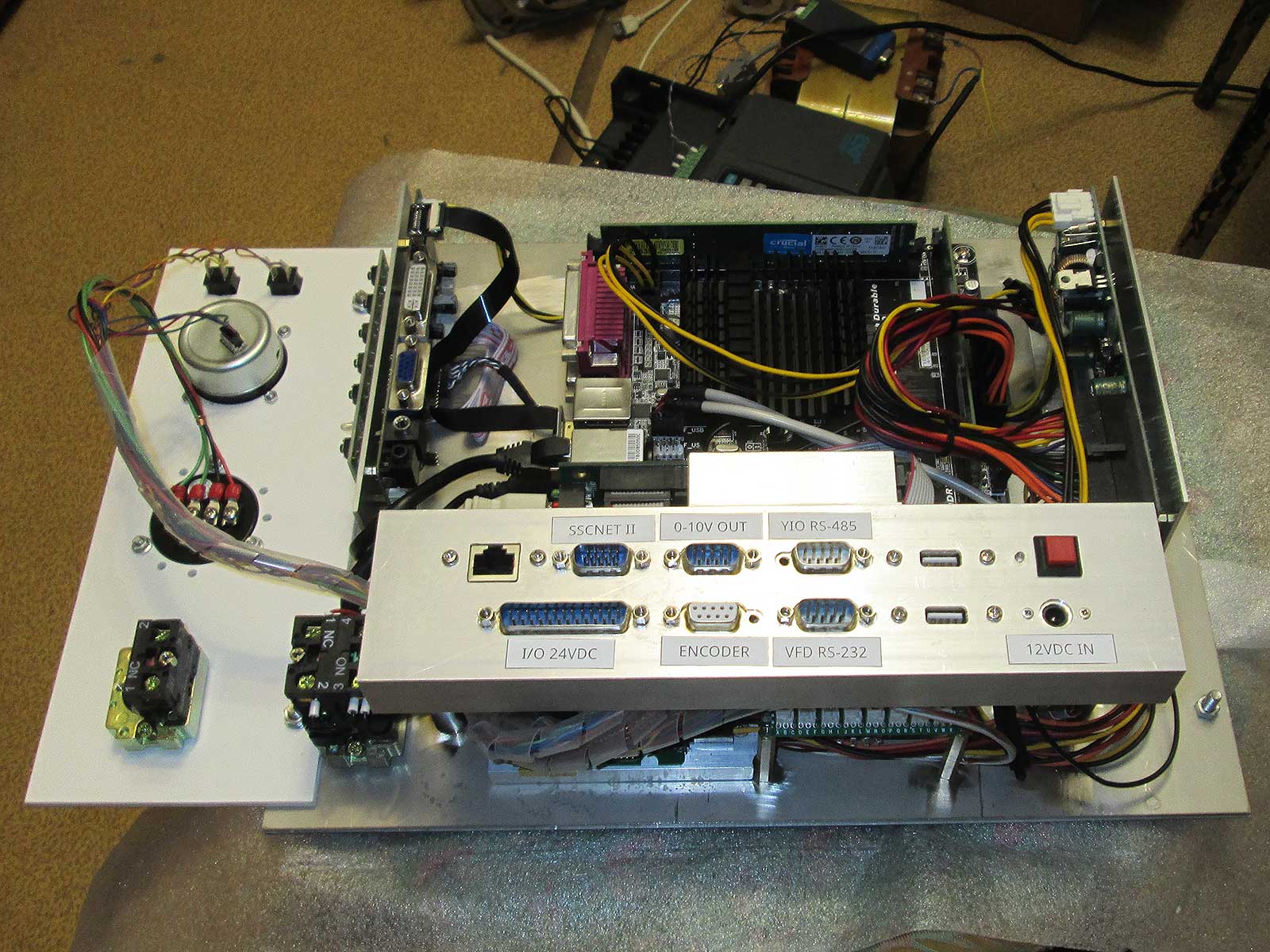 Справа - обычный "одноплатник" - компьютер, разъёмы все стандартизированны(перепутать сложно)! зелёная платка над компом - либо палата "клавиатуры", либо "сенсора"(смотря что на морде приделано).