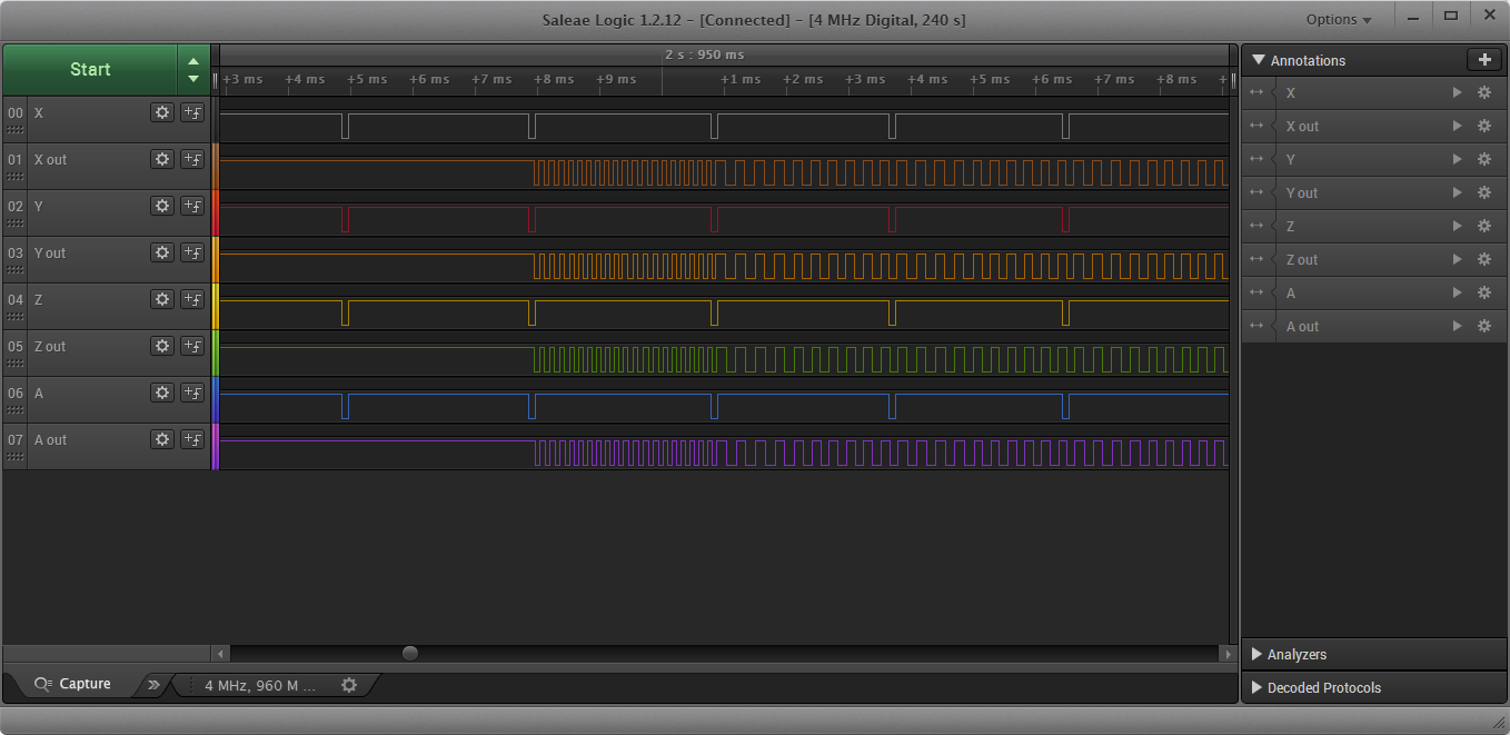 Сейчас генератор импульсов использует отдельный таймер для каждой оси, хотя у каждого таймера есть внутри 4 отдельных канала. Дёргать выходные пины каждый канал может независимо. Зависят каналы только от общей частоты работы таймера. Почему бы не использовать для каждой оси по каналу, а не по целому таймеру? В связи с этим и появилась идея использовать общую частоту таймера как несущую. А каждый канал будет "как-то" подстраиваться под несущую частоту для генерации импульсов оси. Вот над этим "как-то" я сейчас и думаю.