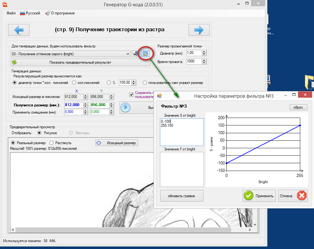 5) Кнопка вычислить автоматически просчитывает данные в отображаемом модуле, если это возможно без вмешательства пользователя, например выбрав файл рисунка, можно сразу перейти на последний кадр, и нажать вычислить, и программа получит изображение, если нужно скорректирует его, потом получит контуры, и сформирует G-код.