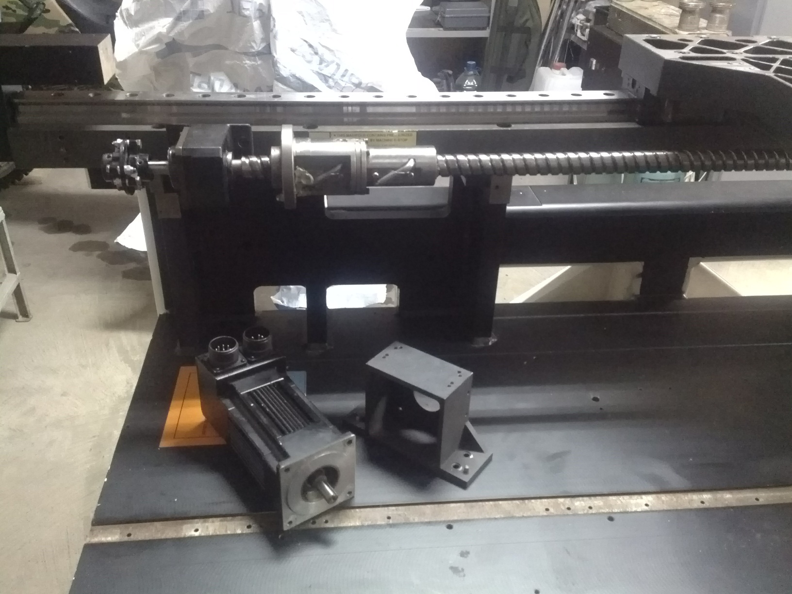 Конструктивно продольная ось (Х) выполнена в виде двух стальных фрезерованных балок сечением 44х137, длиной 1695, на которых закреплены рельсы, а с торца балки опоры винтов на штифтах и болтах. Этакий универсальный конструктор. Эти балки (с рельсами и винтами) прикручены к четырем опорам станины. Просвет между плоскостью кареток Х и столом 360 мм. Расстояние между рельсами 1260.