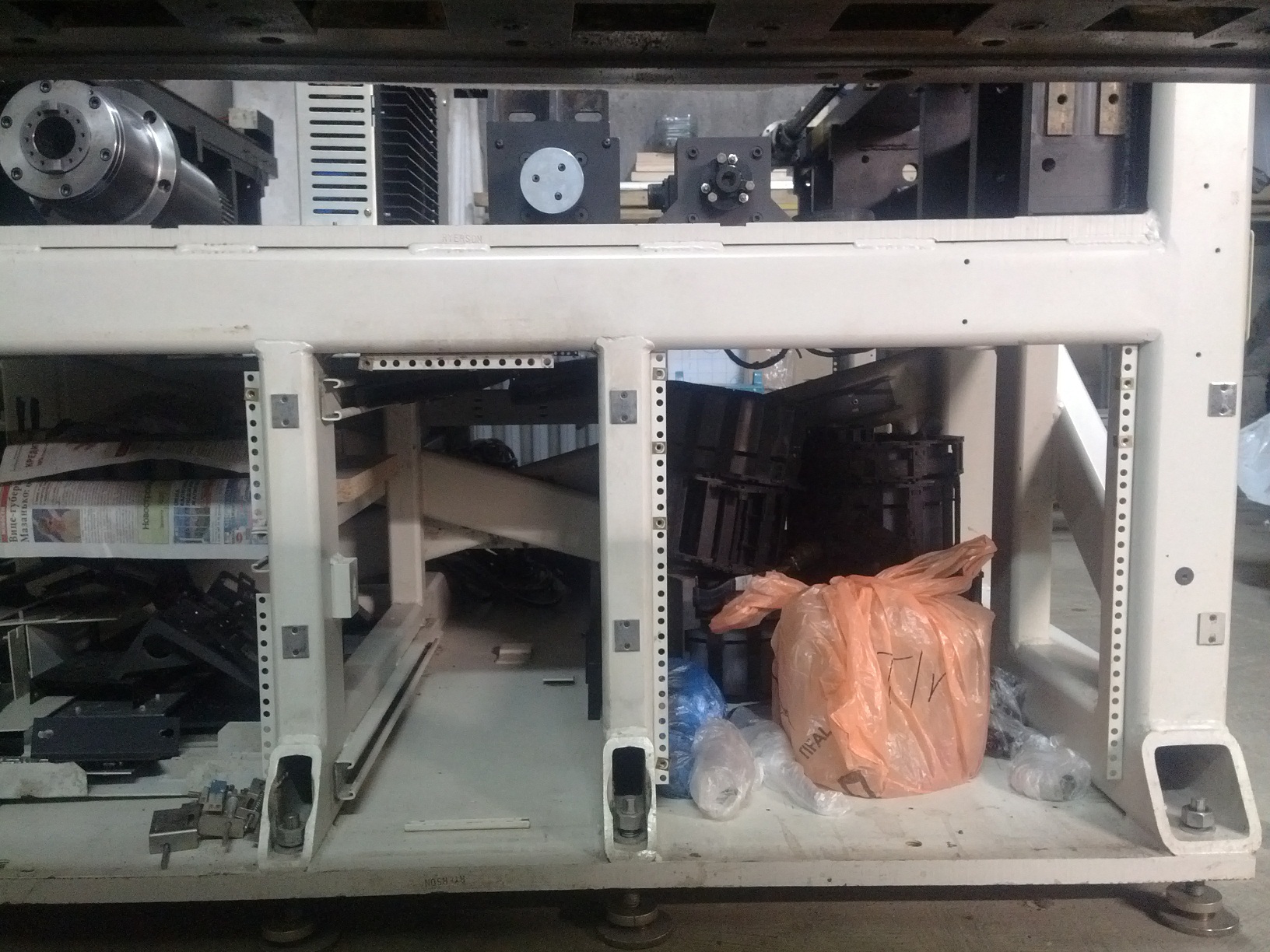 Станина заводская сварная из профтрубы 102 стенка 12. Снизу лист 26 мм, сверху (стол) лист 20 мм. Внутри станины во всех направлениях тоже каркас и диагонали. Вес без всего навесного 2300 кг. Восемь опорных лап.