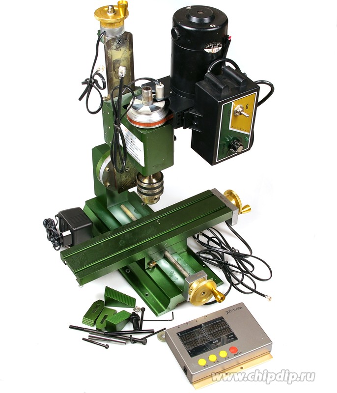 В комплекте сверлильный патрон, переходник с МТ1 на 6мм, коробка индикации координат с блоком питания, куча ключей, креплений, болтиков и т.д. как в магазине + запасной полиуретановый ремень. Если нужно могу отдать переходник с 6 мм на 3.175 мм.