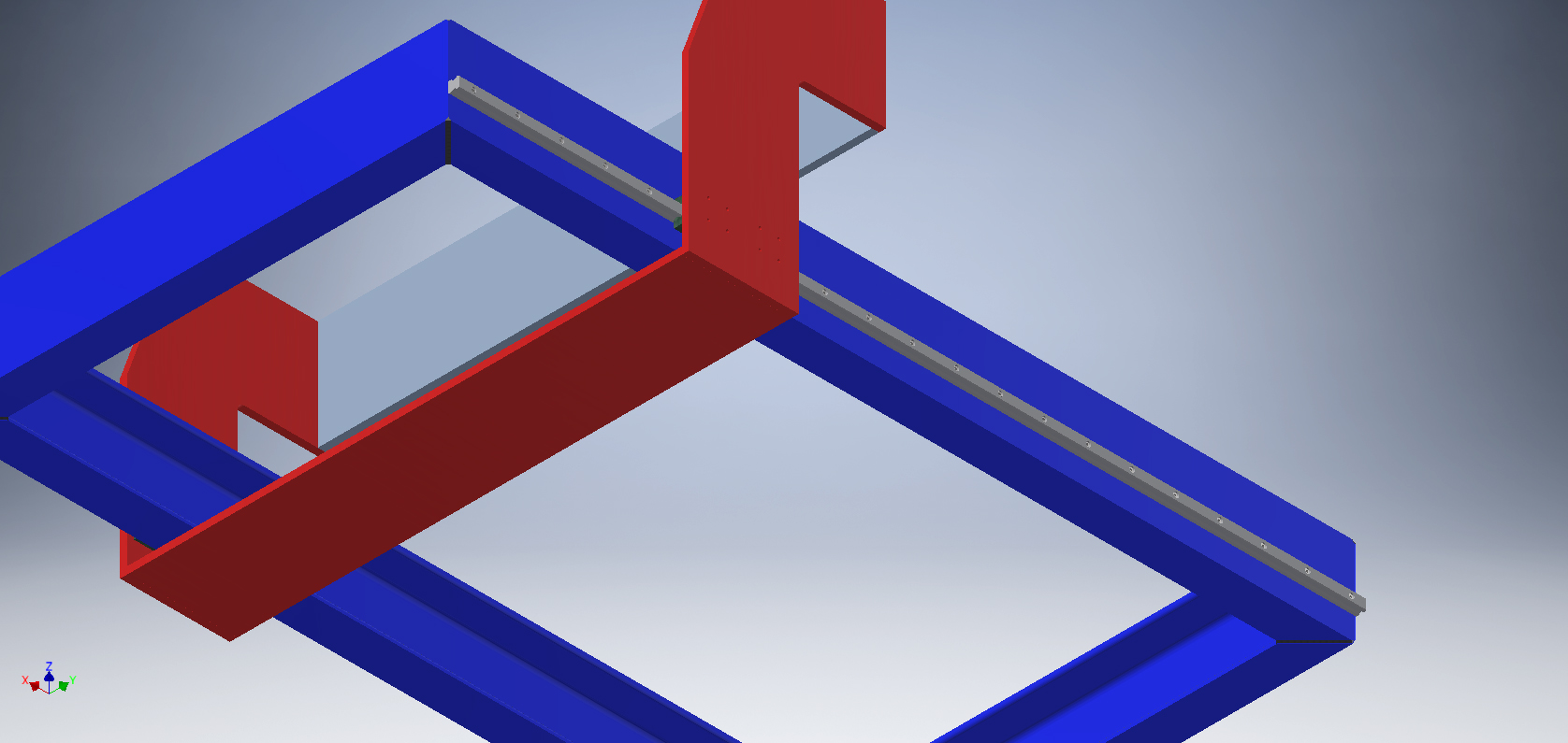 А если два винта, но снизу по оси Y? Рельсы по оси X поднять повыше (что начерчены). Сверху стоики соединить также алюминиевым профилем (кстати, не понял, какой у вас).