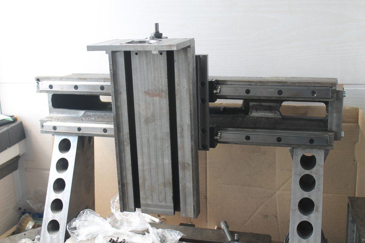 Полагаю, что на токарной станине надо сфрезеровывать призмы и примерно на их месте располагать рельсы, т.е. станина будет лежать как бы на боку. На колонне Z тоже будут рельсы. Каретки по Y и по Z спиной к спине через переходную плиту.