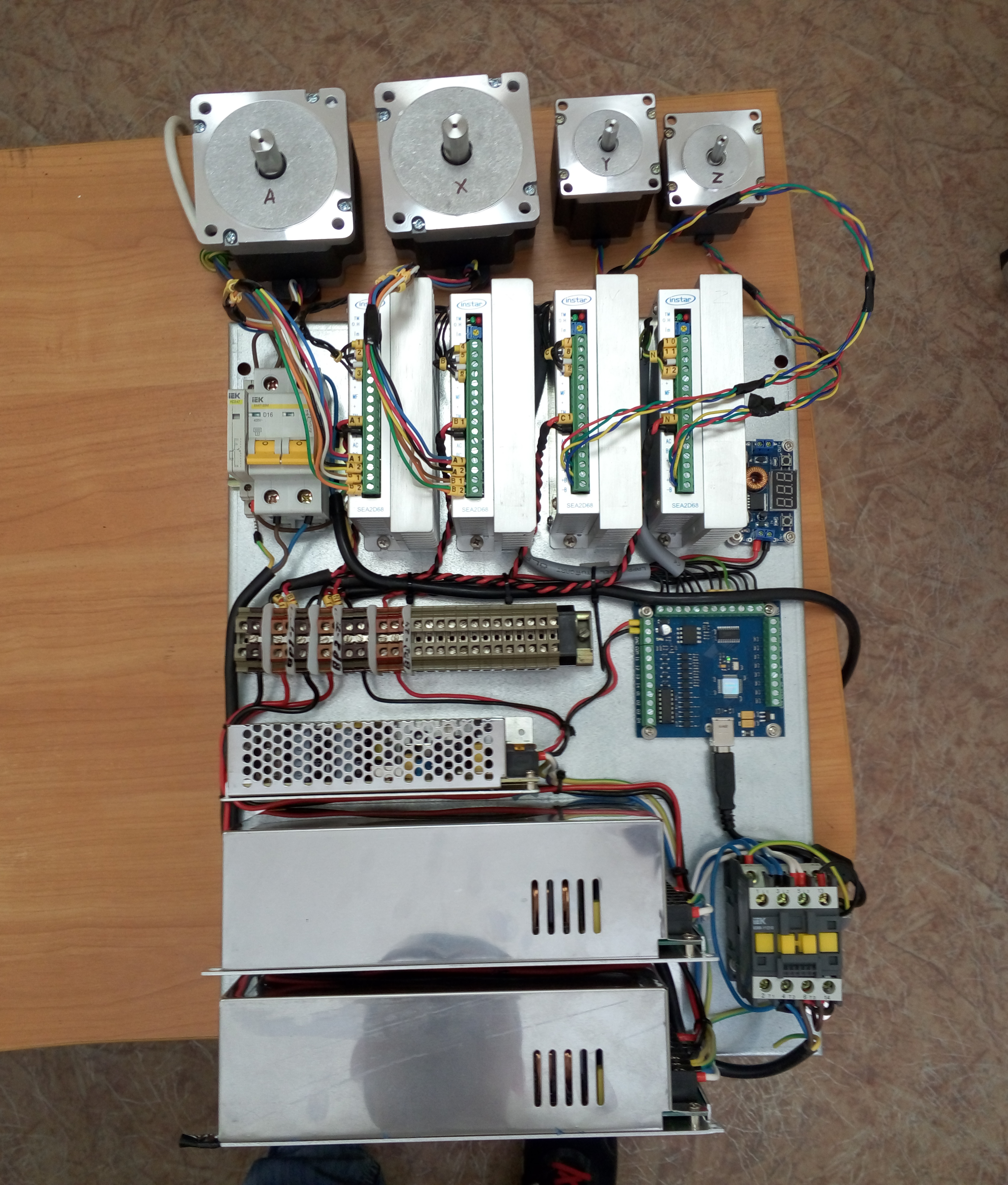 Пока занимался шкафом управления столкнулся с проблемкой, драйвера у меня интересные пишут что цифровые, фиг информацию по ним найдешь, интерфейсная плата USB Motion Card (STB4100). Так вот собрав все в кучу при предварительном пуске моторы не закрутились.Сигнал на драйвера вроде идет зеленая лампочка на драйвере еле помигивает когда запускаю тестовый G-cod но на удержание моторы не ставятся. Не пойму правильно ли я подключил Пульс и Дир вот на фотке панель драйвера
