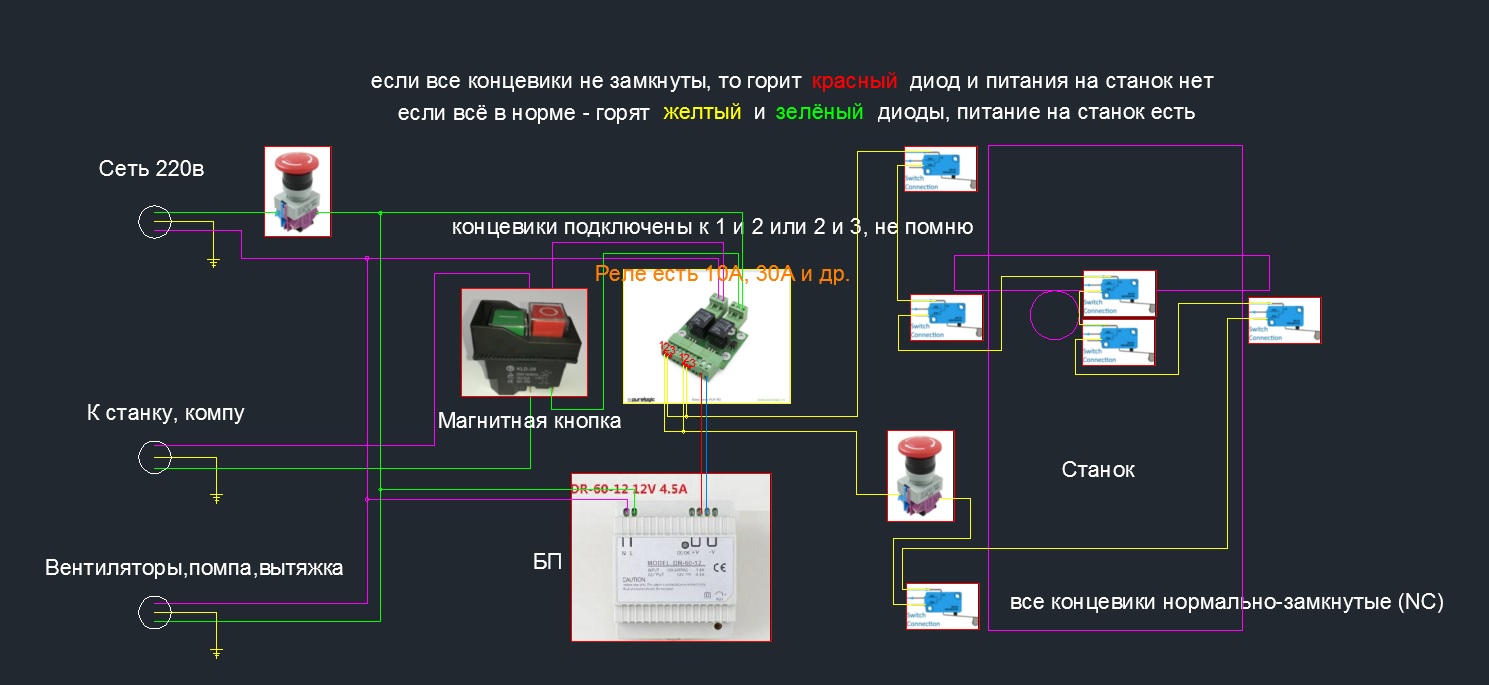 https://ru.aliexpress.com/item/WSFS-Hot ... 0.0.iyzLDP Что удобно, так это то, что можно по звуку и цвету светодиодов быстро проверить все концевики(такой надобности конечно особо нет, система просто не включится при любом разрыве всех концевиков). Однажды станок не запускался, я откры шкаф и увидел красные светодиоды вместо желтого и зелёного. Быстро пощелкал микрики и один, судя по звуку, накрылся. Временно на нём скрутил провода и запустил всё, потом новый припаял. У меня на столе стоит поворотка и шпиндель может при пропуске шагов в неё въехать, и в стол тоже. Тут читал, что кто-то выключил насос на шпиндель, а станок включился потом. Этого можно было легко избежать. Можно подключить что нужно до магнитной кнопки(вытяжка, насос, вентиляторы) и в случае возобновления электричества они снова заработают, а что-то (комп, инвертер, двайвера) уже после, и они сами уже не включатся никак. Думаю новичкам не мешала бы такая защита.