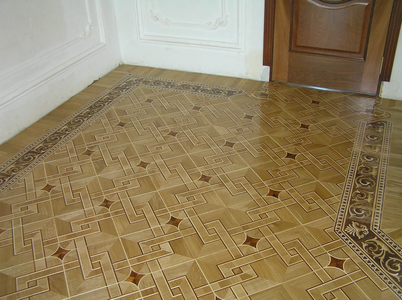 На дверях накладки временно лежат, сосновые пробы.