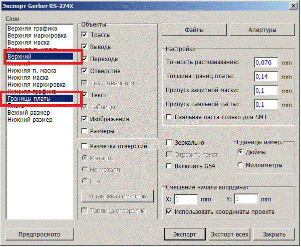 в диптрейсе делайте экспорт верхнего и нижнего слоев вместе с контуром платы (предварительно его обозначив): это нужно для того, чтобы при импорте в cam350 была привязка по координатам к этой границе, иначе у вас будет автоматически построена граница самой CAM350 (как это и произошло) и строится она будет по границам дорожек, а поскольку в верхнем и нижних слоях дорожки расположены по разному,соответственно и координаты верхнего слоя "убегут" относительно нижнего.shyrik76rf писал(а):Здравствуйте. Подскажите в чем проблема и как с ней бороться... Пробую из дип трейса экспортировать гербер нижнего слоя платы размером 163х113 мм, открываю его в CAM350, открывается корректно. Дальше, как по видеоинструкции со стр. 18 данной ветки, запускаю макрос gerber2dxf и открываю свой гербер файл. Открывается моя плата, вокруг которой появляется красный прямоугольник , который перекрывает несколько выводов и в результате получается кривой дхф файл. В чем проблема? Может макрос не рассчитан на такой размер платы? Кто-нибудь делал относительно большие платы таким способом?