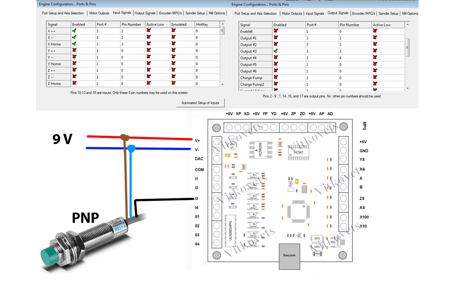Почти та же картина, только не работает датчик Home. Подключил как на рисунке ниже. В чём может быть проблема? Дтачик PNP. Настройки поставил точно как в инструкции. Диод на датчике загорается при приближении металла и сам датчик закрывается, проверял тестером.
