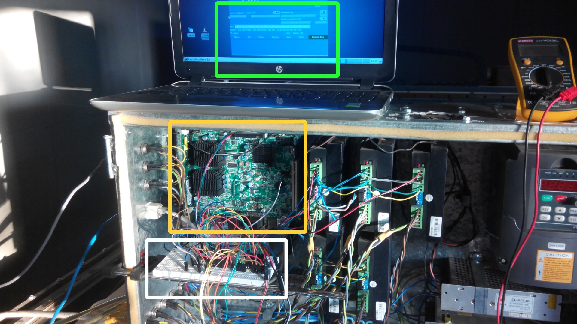 Сегодня часа 4 ушло на последовательные тесты умножителя в деле - на станке. Поставил электроящик на стол. К стенке ящика прикрутил струбцину и на неё установил монтажную платку с умножителем. Умножитель подключен к LPT порту. Питается умножитель прямо с материнки от 5V. Управление - LinuxCNC. На монтажной платке расположились 3 модуля: