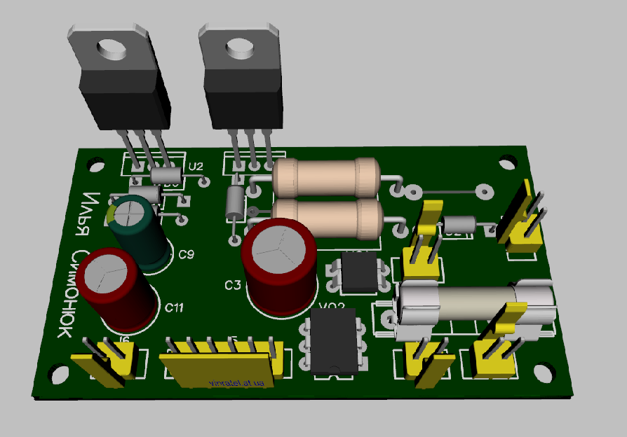 Поскольку у меня просматривался вариант использования для сверлёжки РСВ любимых моих ДПМ, то я этот вариант делать не стал и разработал следующую версия (v3.01), в которой конвертирование напряжения осуществляется трансформатором и потому можно намотать обмотку на любое напряжение - как требующееся для моих ДПМ 48 Вольт, так и любое другое - например, 8 Вольт. Или даже 220 Вольт - для использования в качестве шпинделя какого-нибудь проксона и иже с ним (сохранив при этом, управление шпинделем от кода).