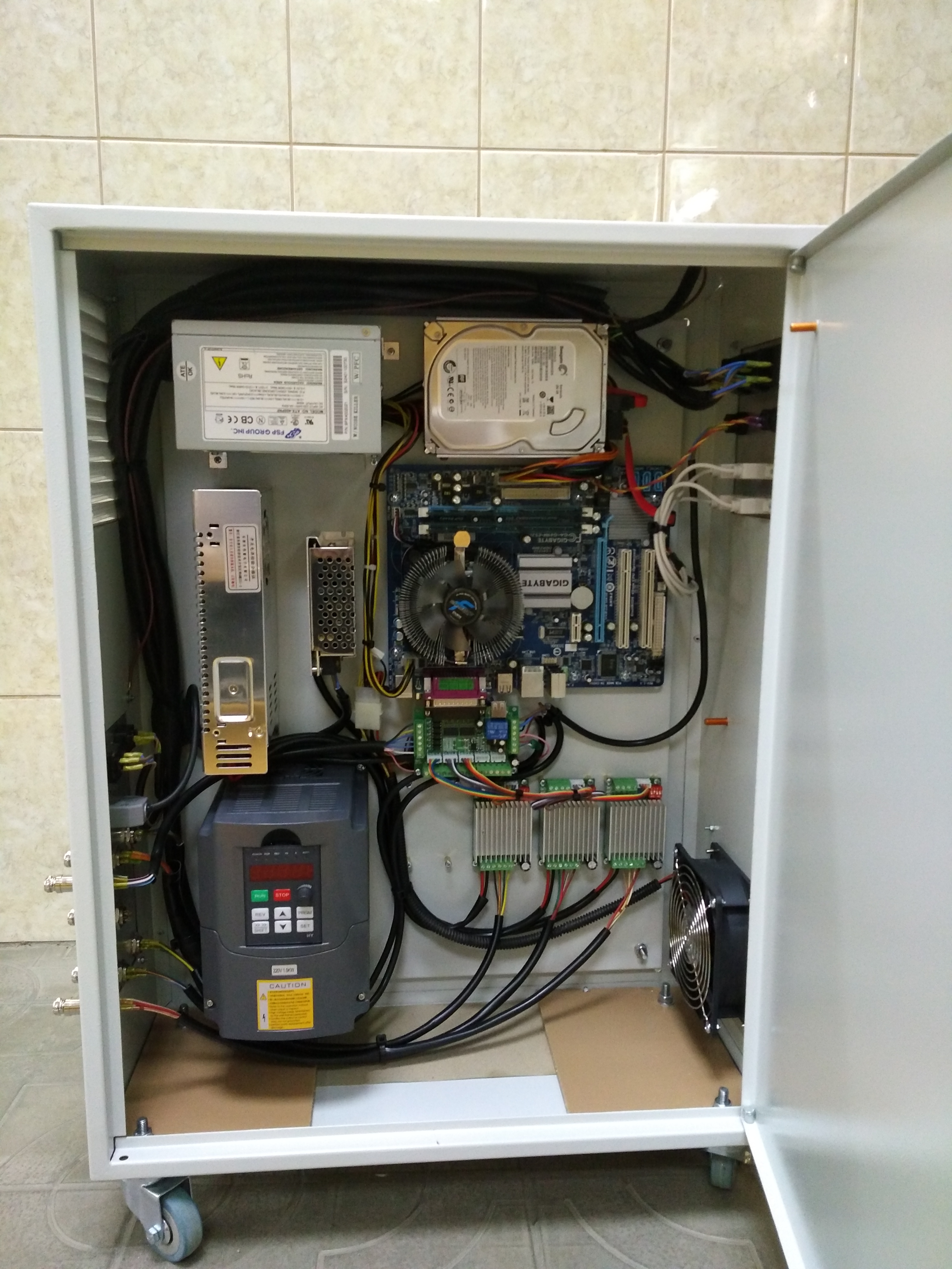 У станочка оси Х и Y на цилиндрических рельсах, ось Z цилиндрические валы. По всем осям ШВП 1605. Шпиндель водяной китаец ER16, 1.5KW, 24000 об.