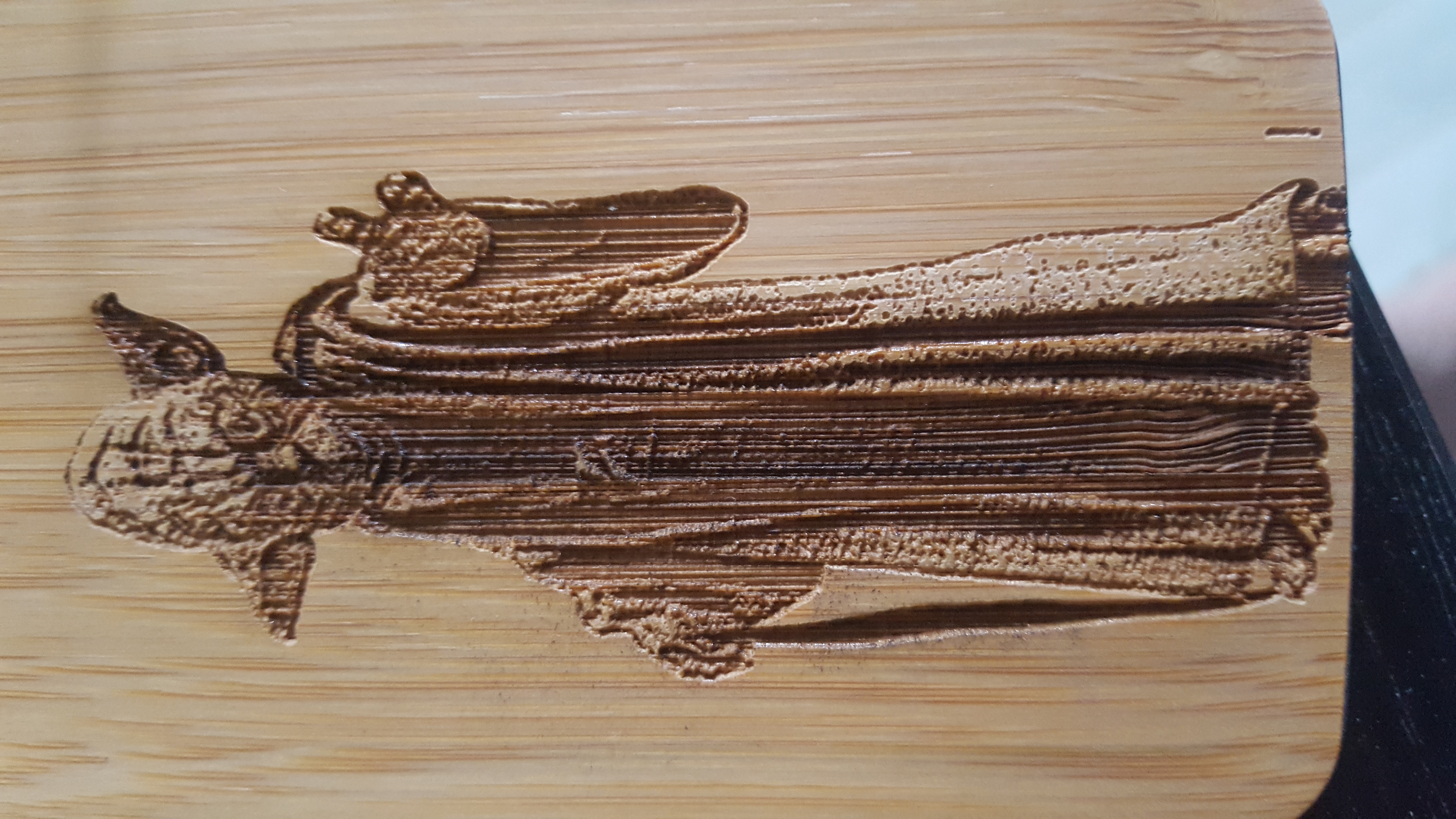 ну а по остальным картинкам видно, что нужно уменьшить диаметр точки, если это уже невозможно сделать изменением фокуса, то подбирать размер точки в файле путём изменения количества пикс/дюйм, а ещё лучше увеличить размеры картинки, тогда детализация будет выше. Тут важно, чтобы размер выжженой точки на фанере примерно соответствовал размеру одного пикселя в файле, например если картинка с разрешением 300 пикс/дюйм, то размер пикселя - 0,08 мм, а если 100 пикс/дюйм, то 0,254 мм.