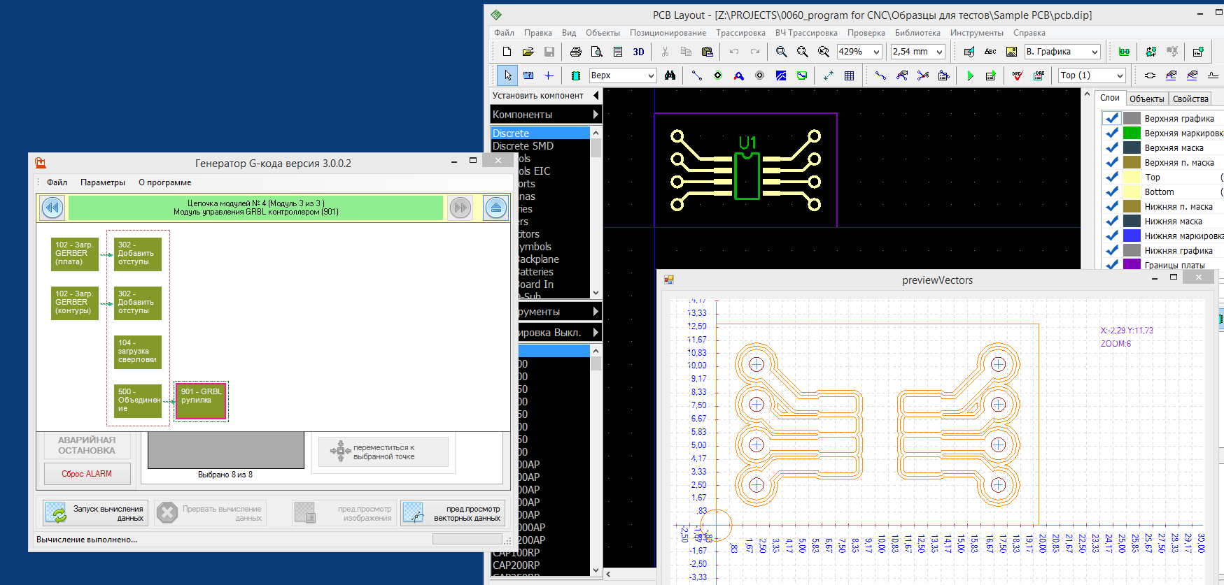 Сейчас в принципе полное раздолье в плане реализации логики работы, т.к. я специально написал сендер для прошивки GRBL 1.1 и в строил его в программу в виде модуля, благодаря чему теперь последний шаг может быть не только генерация текста G-кода, но сверловка со сменой инструмента, фрезеровка контуров, и т.д.