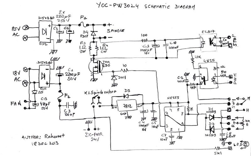 Поскольку у меня просматривался вариант использования для сверлёжки РСВ любимых моих ДПМ, то я этот вариант делать не стал и разработал следующую версия (v3.01), в которой конвертирование напряжения осуществляется трансформатором и потому можно намотать обмотку на любое напряжение - как требующееся для моих ДПМ 48 Вольт, так и любое другое - например, 8 Вольт. Или даже 220 Вольт - для использования в качестве шпинделя какого-нибудь проксона и иже с ним (сохранив при этом, управление шпинделем от кода).