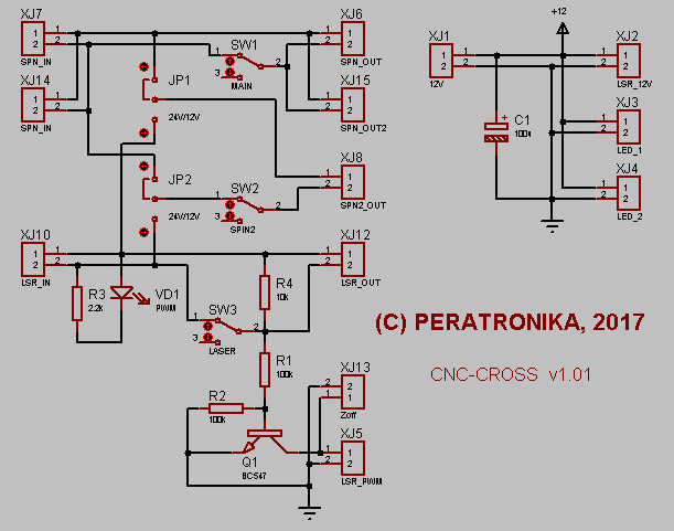 Здравствуйте! я недавно собрал 3018 на Woodpeaker-е, механика норм, а вот лазер работать никак не хотел. У меня на 5,5 Вт со своим контроллером. В конце концов я подключил его от доп. вывода 12 В и на +TTL снял с затвора транзистора laser out. Работает, но управление, не совсем правильное, т.е. нет максимума при вырезании. Пришёл к тому же выводу, что без доработки не обойтись. Хочу сделать что то наподобие CNC-Cross ver.1.01, но упростить оставить ШИМ и добавить доп. разъем для ДПМ и вентилятора, чтоб дым сдувал. Хотел уточнить, в вашей версии XJ10 подключается к Laser/Spindle, XJ14 - к Spindle, а куда XJ7? И ещё хотел уточнить назначение вывода XJ13 (Zoff). Да, и заземление у Вас в схеме нарисовано, откуда лучше взять? Вот, ещё чуть не забыл, я Woodpeaker-а перепрошил на grbl v.1.1f.... Прошу, отнестись к моим вопросам снисходительно поскольку только начинаю осваивать...