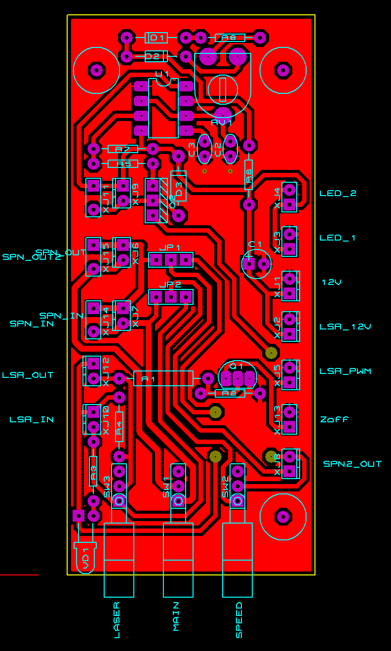 Такая доработка позволяет использовать лазер для прорезки контуров ПП из обычного софта, рассчитанного на механическую обработку - инструмент автоматически выставляется в зону безопасности при перемещении к следующему контуру, а вот выключение шпинделя в этих программах не предусмотрено.