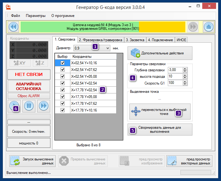 4) Сверловка подразумевает что высота по Z=0 на уровне печатной платы, поэтому глубину сверловки указывать отрицательную. Высота подхода Z, это высота на которую поднимается сверло для перехода к следующей точке. Все перемещения и подъем сверла выполняется на максимальной скорости. И только опускание сверла управляется параметром.