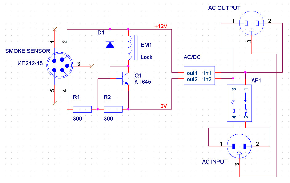 Для обнаружения дыма служит стандартный пожарный извещатель ИП212-45. При появлении дыма извещатель замыкает цепь сигнализации, но допустимый ток для срабатывания электромагнита недостаточен. Поэтому для согласования с электромагнитом применен простой ключ на транзисторе.