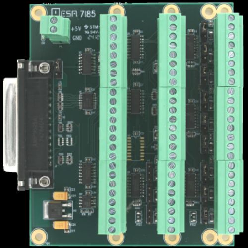 There are currently six 5I25 compatible breakout cards available from Mesa, the 7I74 through 7I78 and 7I85. The 7I76 is a step/dir oriented breakout with 5 axis of buffered step/dir outputs, one spindle encoder input, one isolated 0-10V analog spindle speed plus isolated direction and enable outputs, one RS-422 expansion port, 32 isolated 5-32V inputs and 16 isolated 5-32V 300 mA outputs. The 7I77 is a analog servo interface with 6 encoder inputs, 6 analog +-10V outputs, one RS-422 expansion port, 32 isolated 5-32V inputs, and 16 isolated 5-32V 300 mA outputs. The 5I25 supports two breakout cards so for example a 10 Axis step/dir configuration or 12 axis analog servo configuration is possible with a single 5I25 and two Mesa breakout cards.