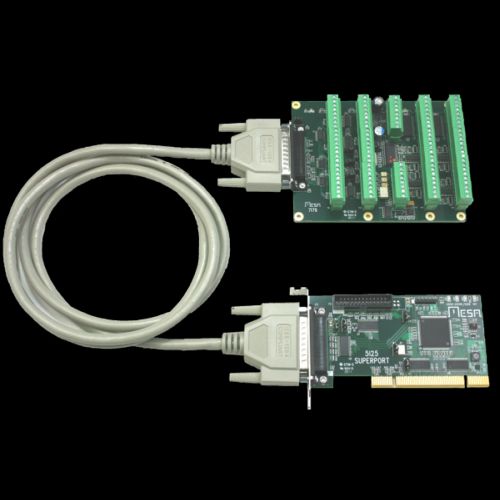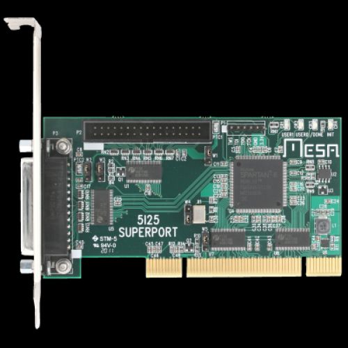 The MESA 5I25 is a low cost, general purpose, FPGA based programmable I/O card for the PCI bus. The 5I25 is a low profile PCI card (available with low profile and standard brackets, low profile bracket shown here) that uses standard parallel port pinouts and connectors for compatibilty with most parallel port interfaced motion control / CNC breakout cards/ multi axis step motor drives, allowing a motion control performance boost while retaining a reliable real time PCI interface. Unlike the parallel port that the 5I25 replaces, each I/O bit has individually programmable direction and function. The 5I25 is a universal PCI card so will work in 5V and 3.3V systems. the 5I25 provides 34 I/O bits (17 per connector) All I/O bits are 5V tolerant and have pullup resistors. A power source option allows the 5I25 to supply 5V power to breakout boards if desired. This 5V power is protected by a PTC. Firmware modules are provided for hardware step generation, quadrature encoder counting, PWM generation, digital I/O, Smart Serial remote I/O, BISS, SSI, SPI, UART interfaces and more. Configurations are available that are compatible with common breakout cards and multi axis step motor drives like the Gecko G540. All motion control firmware is open source and easily modified to support new functions or different mixes of functions.