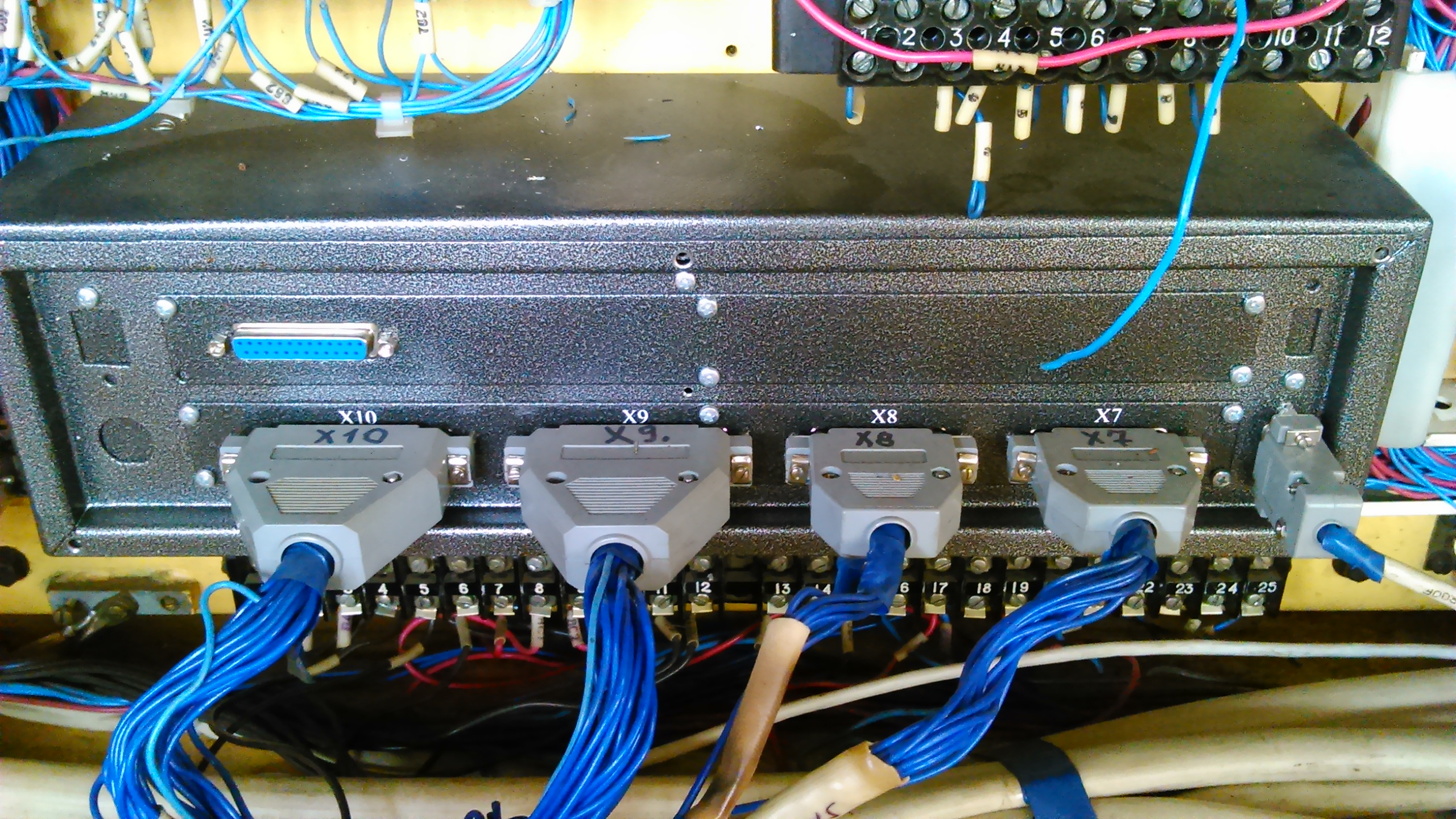 Существует распиновка, постараюсь на днях узнать! По фотам сто пудов нет полюса на вход, сфоткайте все шкафы, будет быстрее. Плюс идёт от моста через транс 380/19, после подачи общего питания, т.е. включили рубильник и возле него кнопка пуск.