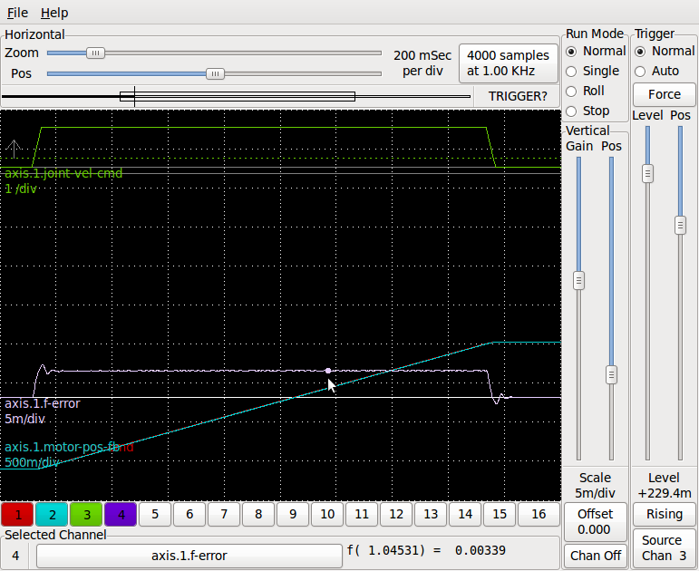 судя по халскопу и масштабу сигналов у тебя ошибка в расчёте значения в два раза - похоже серва перемещается на вдвое большее (или меньшее, лень соображать) расстояние, чем требуется по заданию. В итоге то, что реально проехала серва отображается в pos-fb, а в f-error разница между pos-cmd и pos-fb.PaulK писал(а):А можно узнать влияние ENCODER_SCALE на FERROR?
