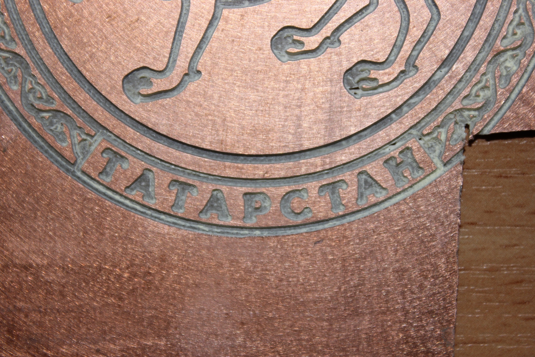 Еще раз выгравировал герб, заглубление получилось просто зверским, просто опасался сюрпризов от оси Z, поэтому подложил под текстолит то, что было - обрезок ДВП, середину выгнуло. Ну и видимо неточно ноль выставил по Z к тому же. Но рамка с надписью не смещается уже вправо, а вот заглубление немного выросло (потому что теперь Z болеет этой болезнью, что раньше X)