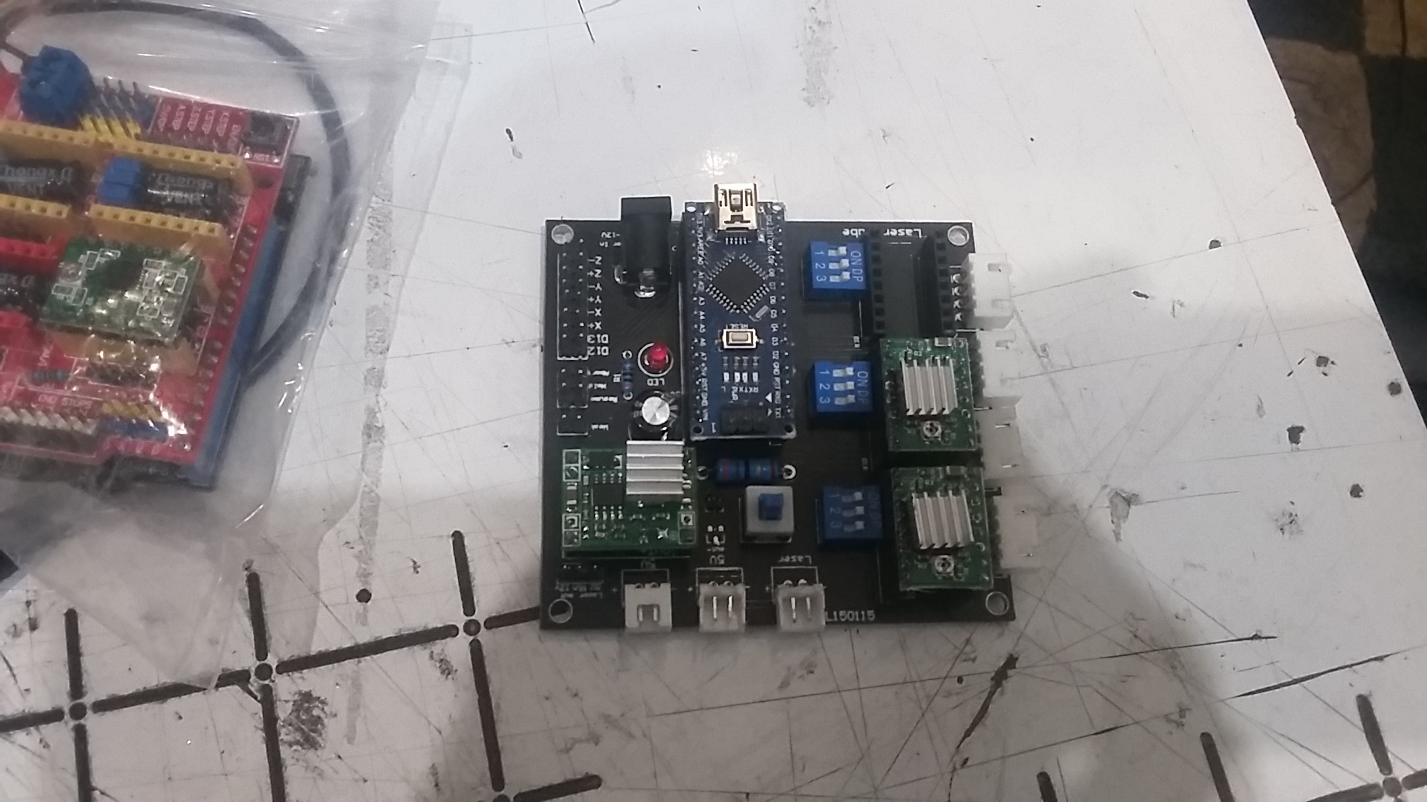 Сам собирал первый из фанеры 12мм шаговики из принтера HP LJ1100, плата ардуино и cnc шилд как у вас на первом фото электроники. Прошивка gbrl 0.9j (если память не подводит)